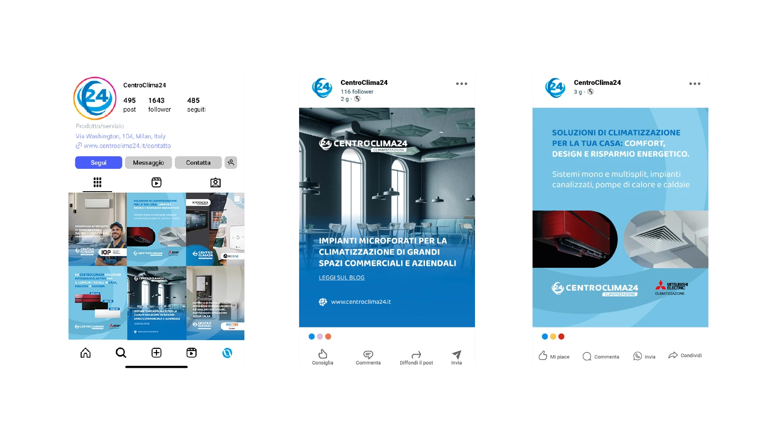 Per CentroClima24 abbiamo ridefinito l’identità di marca, pianificando e sviluppando una strategia di comunicazione integrata su più canali. Insieme al cliente, abbiamo costruito una visual identity solida finalizzata ad aumentare la notorietà e il valore percepito del brand in un contesto a elevata competizione dove risulta indispensabile differenziarsi. Ridefinire l’identità visiva e pianificare con efficacia, in particolare sui canali digitali, ha permesso ottenere lead qualificate da ogni categoria di target.